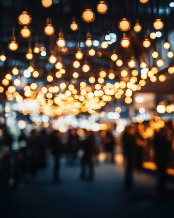 A lively trade show showcases modern booths under glowing lights, creating a warm atmosphere. Attendees mingle in the blurred background, engaging and networking amidst the vibrant setting.