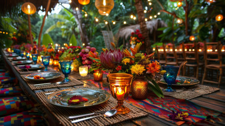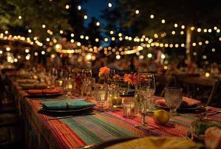 A long table is set outdoors under soft lights, suggesting a festive dinner party. The scene showcases glasses, plates, and floral arrangements. The colorful tablecloth and warm lighting create a celebratory atmosphere. Suitable for editorial and commercial use, such as event promotion or lifestyle content.