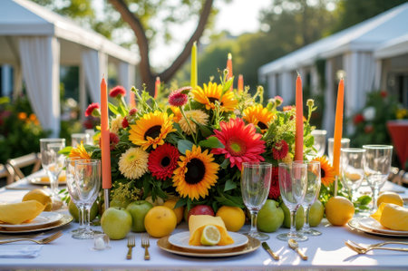 Vibrant outdoor table setting with sunflowers and fruits for summer gathering. That the image is generated using AI.