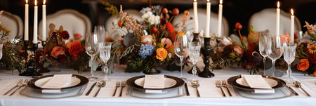 Festive table setting with pink flowers and candles in a luxury restaurant