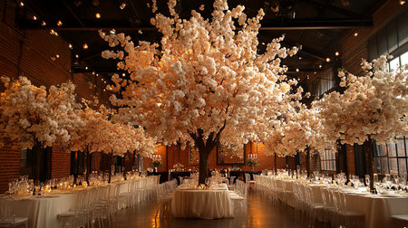 Spacious indoor event venue featuring multiple tall artificial cherry blossom trees with dense white and light pink flowers.