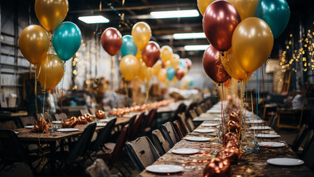 A festive scene depicts an indoor gathering, featuring elaborate decorations with gold and silver balloons. Floral arrangements enhance the celebration ambiance, and strings of lights add sparkle. Suitable for illustrating events or celebrations, the image could be used for various commercial projects.