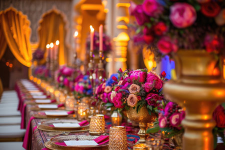 A long wooden table adorned with a vase filled with colorful flowers, Extravagant Arabian nights wedding, AI Generated