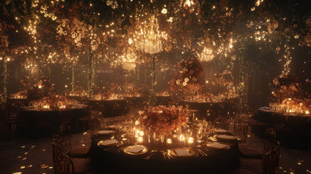 A dreamy golden-hued interior setting with shimmering sparkles, evoking warmth and elegance for event or design concepts.