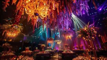 luxury event decor, the opulent event halls grand ballroom is embellished with elegant floral displays, detailed candelabras, and ornate ceiling moldings, radiating sophistication