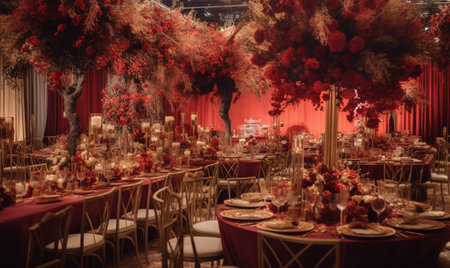 Table setting red napkins and glasses gold plates Interior of a wedding tent decoration ready for guests Decor flowers Red theme : Generative AI