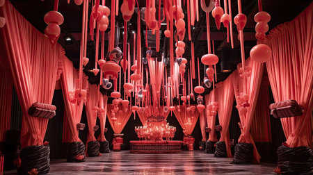 An elegant display featuring colorful balloons, rich silk fabrics, and shimmering golden confetti, creating a lavish celebratory atmosphere