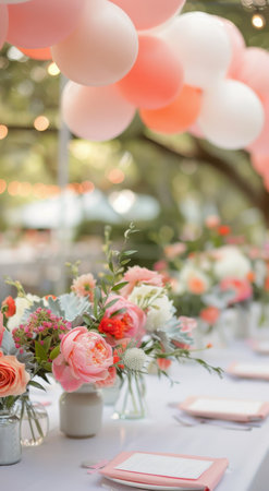 A beautifully arranged banquet table adorned with colorful floral centerpieces, set outdoors. Soft pastel balloons float above, creating a festive atmosphere for the gathering.