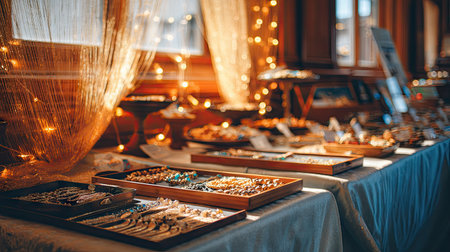 A beautifully arranged selection of handcrafted jewelry displayed at an artisan market. The warm lighting and elegant decoration enhance the charming atmosphere, showcasing unique designs and intricate craftsmanship.