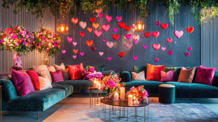 A beautifully designed living room featuring elegant heart decorations and stunning floral arrangements, perfect for creating a romantic ambiance during special occasions.