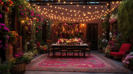 A charming outdoor dining area elegantly adorned with vibrant flowers and soft lighting. The inviting space features a beautifully set table, perfect for gatherings.
