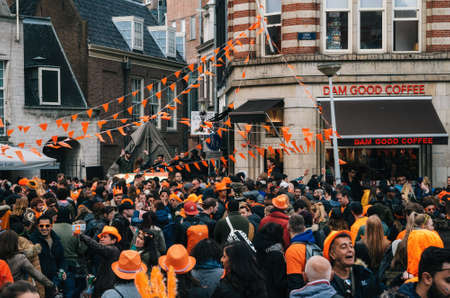Amsterdam, Netherlands - 27 April, 2017: Streets of Amsterdam with orange decorations full of people in orange during the celebration of kings day.