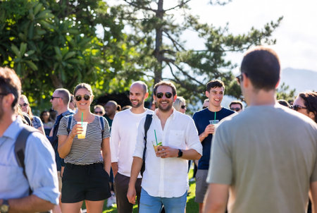 a vibrant outdoor music festival at sunset, capturing the energy of the crowd enjoying live music, drinks and the summer atmosphere. Fun and excitement