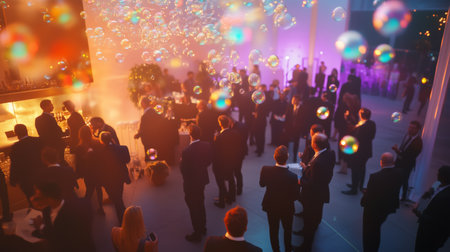 Elegant evening event featuring guests mingling and enjoying floating bubbles in a beautifully lit venue