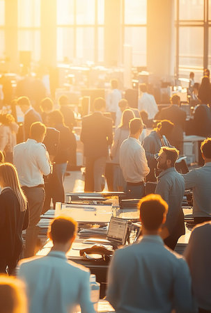 Hectic trade fair with a multitude of stalls and indistinct professionals
