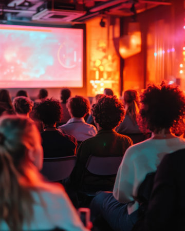 Audience full of people in dark conference hall watching on screen an innovative presentation. Generative AI.