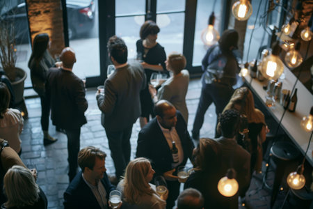 Business people networking at a corporate christmas party, mingling under warm string lights and savoring the festive atmosphere filled with joy and celebration during the holiday season