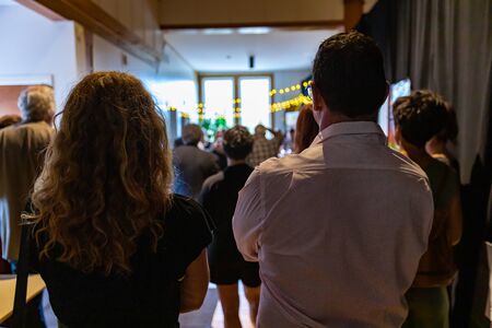 backside view of two adult persons standing next to each other in a congress gathering with other people in the background