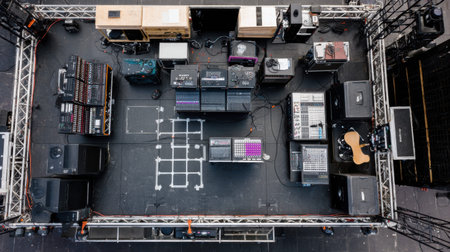 The layout shows various sound system components organized for a live event. Equipment is arranged on a stage area ready for use.