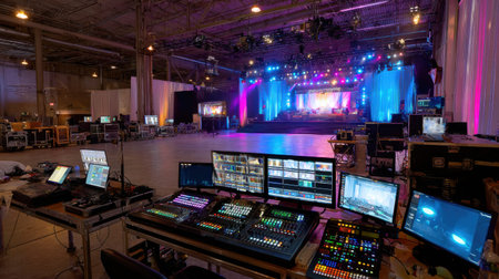 A team sets up professional lighting and technical equipment backstage as they prepare for the show to start in the large venue.