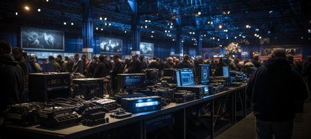 A high-tech gaming setup featuring multiple screens, vibrant lighting, and control equipment in a busy event venue, showcasing the future of entertainment.