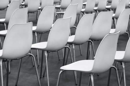 Conference chairs in business room, rows of white plastic comfortable seats in empty corporate presentation meeting office, detail, selective focus