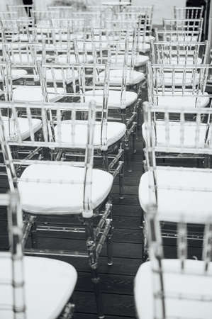 Glass chairs stand in a row in a beautiful wedding outing ceremony