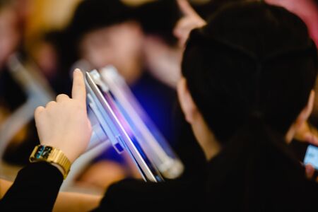 blurry hand and tablet for registration in to seminar event or meeting with people background. blurry image for background. the concept of electronic registration.