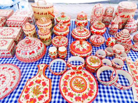Russian folk crafts - traditional wood products with painting - cutting boards, caskets, toys