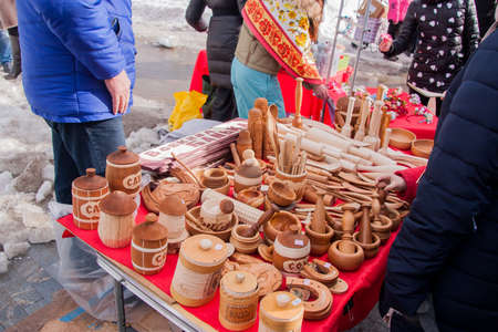 PERM, RUSSIA - March 13, 2016: Trade stalls selling wooden toys and souvenirs in celebration of Maslenitsa