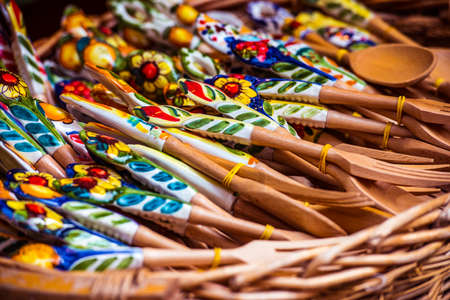 Wooden spoons in souvenir shop in Siena, Italy. Toned picture