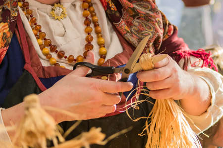 woman in traditional russian clothes making straw doll