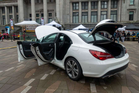 Kuala Lumpur, Malaysia – April 11, 2019 – Car and motocycle displayed at Moto Show in Kuala Lumpur. Exhibitors present most interesting aspects of the automotive industry. The image contains certain grain or noise and soft focus.