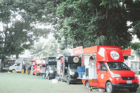 Samut Prakan, Thailand - September 9, 2020 : Food trucks caravan more than five shops that parking​ and​ selling food