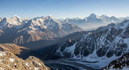 Amazing shot of the Himalayas mountain peaks covered with white snow attracts a lot of climbers and mountaineers.