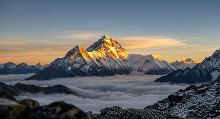 Cholatse peak view from Gokyo Ri. Picturesque mountain valley filled with curly clouds at sunset. Dramatic snowy peak of Cholatse rise above river of clouds. Sagarmatha National Park, Nepal.