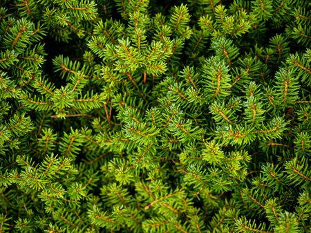 Fir branches texture pattern. Green background of pine branches. Christmas neutral background. Christmas tree branches with needles.