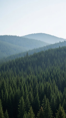 Layers of dense evergreen forest cover rolling hills, softened by a gentle morning mist, creating a serene and atmospheric natural landscape.