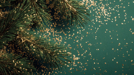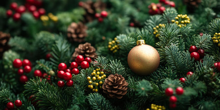 A festive green background with lush fir branches and colorful decorations, providing copy space for holiday promotions, greetings, or messages.