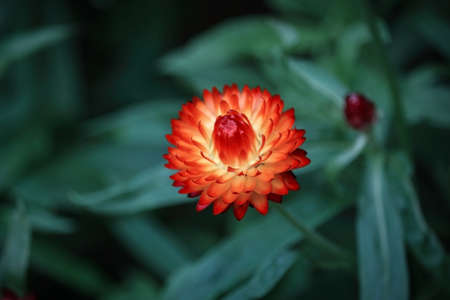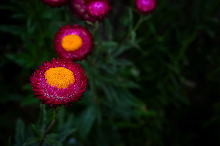 Pink color of Straw flowers or Paper daisy on its tree with dark green blurred garden background.