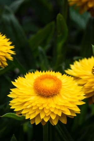 Close up of a yellow strawflower. (Helichrysum bracteatum)