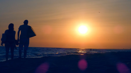 Silhouette of an unidentified couple seeing off the sunset over the Mediterranean Sea on the seacoast in Tel Aviv on a warm evening