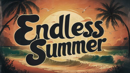 Vibrant sunset scene featuring text endless summer with a tropical beach setting, including palm trees, ocean waves, and seagulls against a warm, glowing sun.