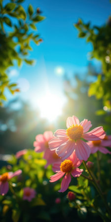 Bright pink flowers basking in sunlight with lush green leaves on a sunny day