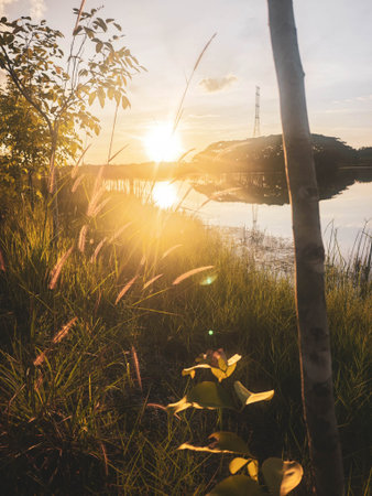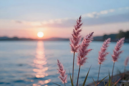 Experience the beauty of a vivid sunset over the ocean, highlighting golden grass swaying gently in the breeze. A perfect moment of nature's tranquility.