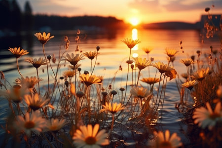 Silhouette of wildflowers against a dusky sunset sky. The image captures the silhouette of wildflowers in a field, set against a gradient sky of orange and gray during sunset creating a peaceful scene