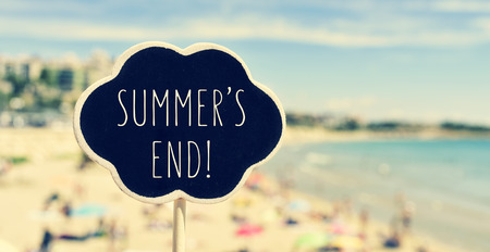 closeup of a chalkboard in the shape of a thought bubble with the text summers end written in it, with a blurred beach in the background, filtered