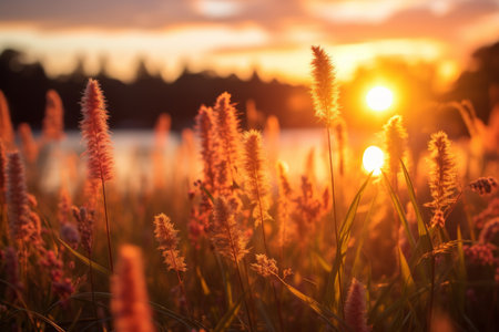 Golden grass blades and thistles on the meadow with the sunset above the hills in the background. romantic setting.