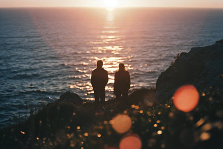 silhouette of a couple holding hands and looking at the sea on the beach during sunset