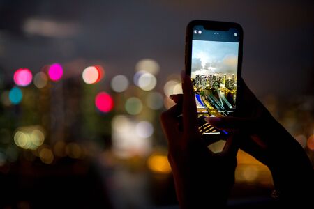 Over the shoulder view of beautiful womans hands holding smartphone and taking pictures of picturesque city at night. Young attractive girl tapping on screen to focus. Camera concept.